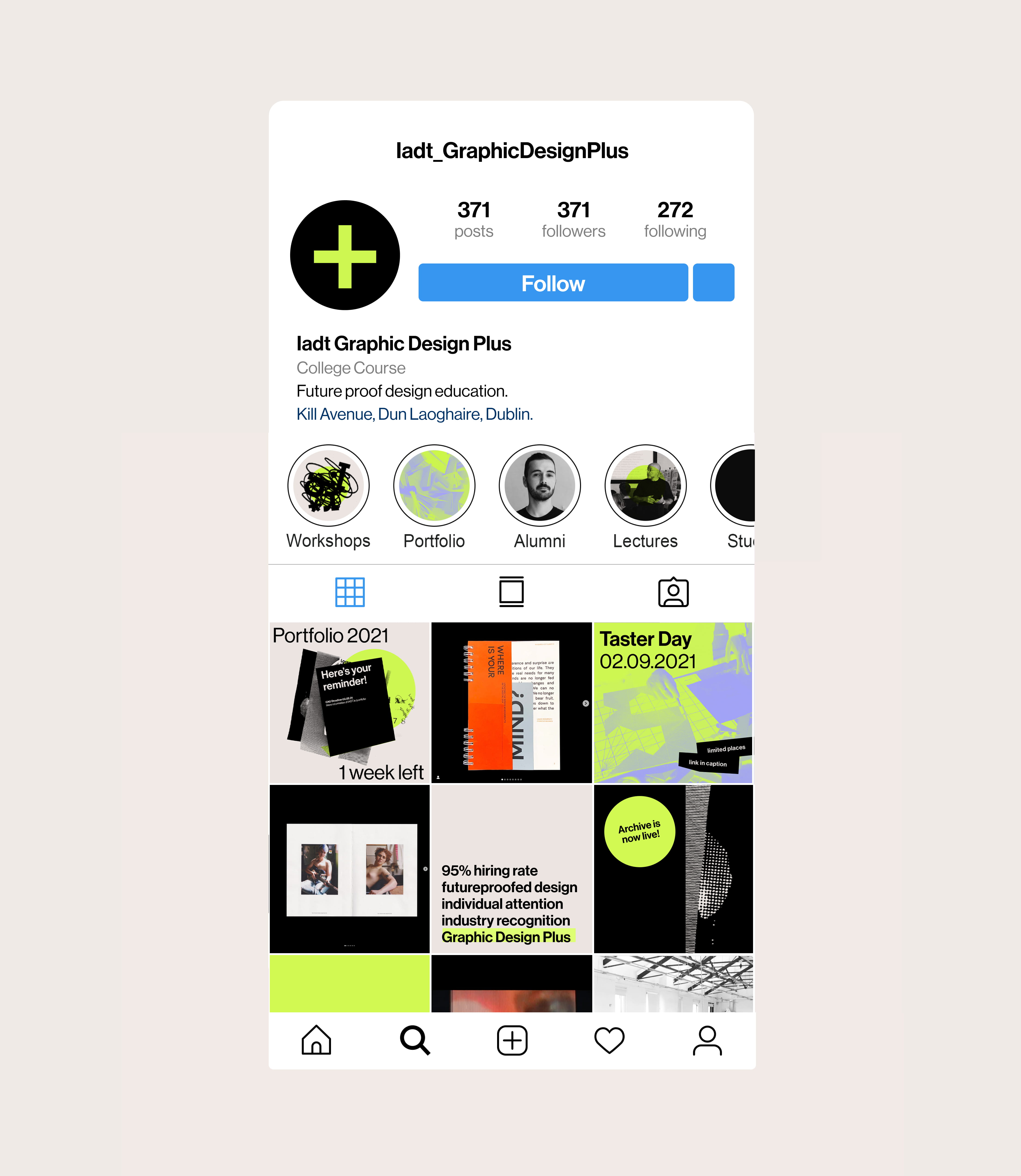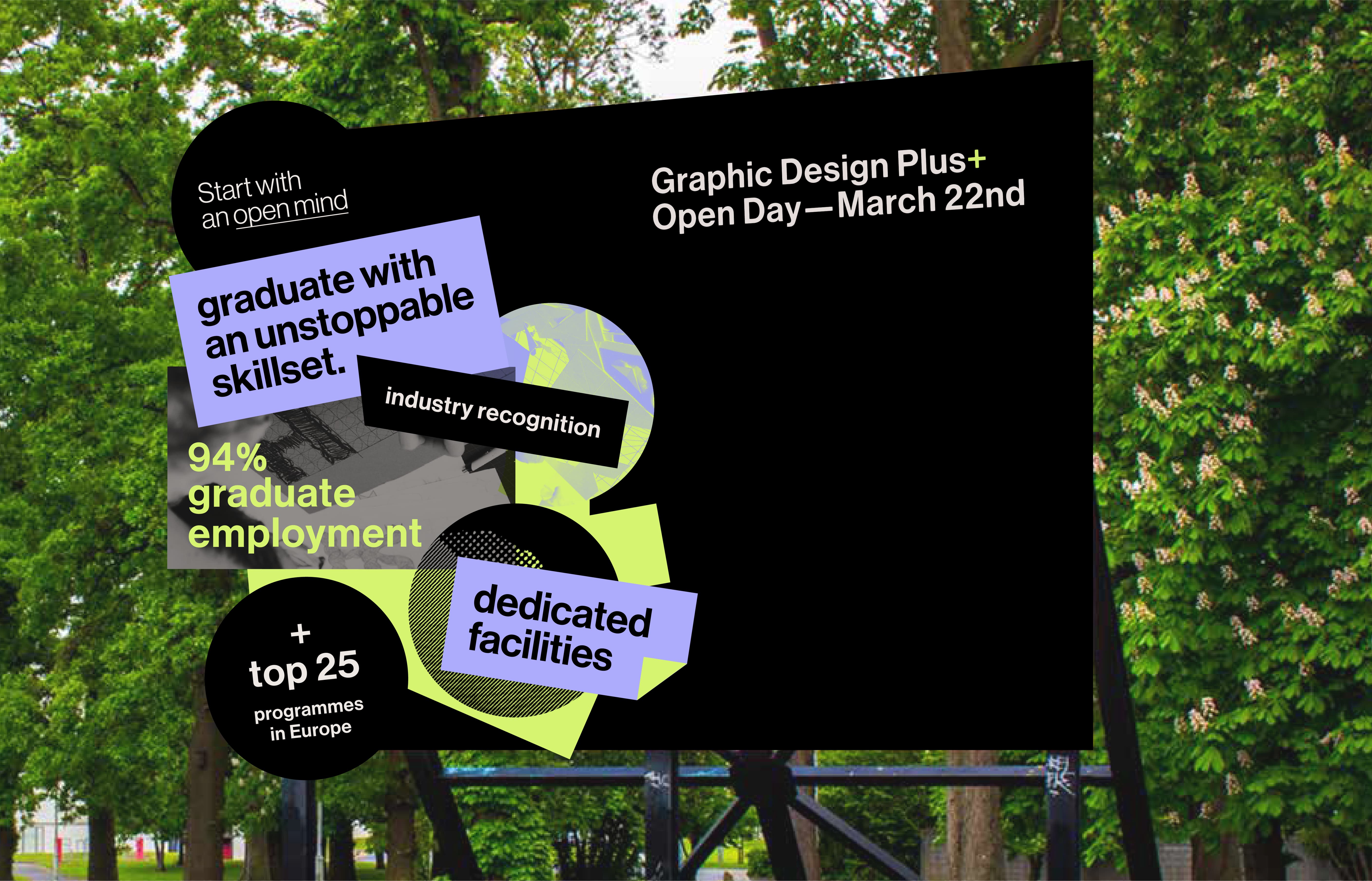 Graphic Design Plus was a rebrand of IADT's Visual Communication Course core philosophy, key differences and advantages in a new visual identity for the course.