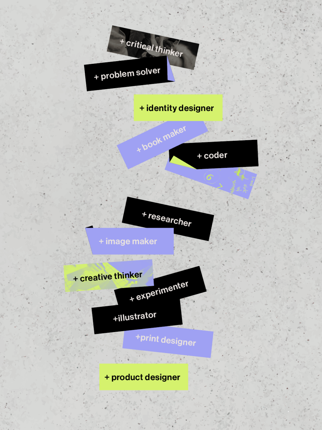 The idea for Graphic Design Plus' identity plays on the idea of "plus" meaning to add and stick on things paired with the visual of layered paper, stickers, photographs and visual clutter from the analogue design aspects of the course